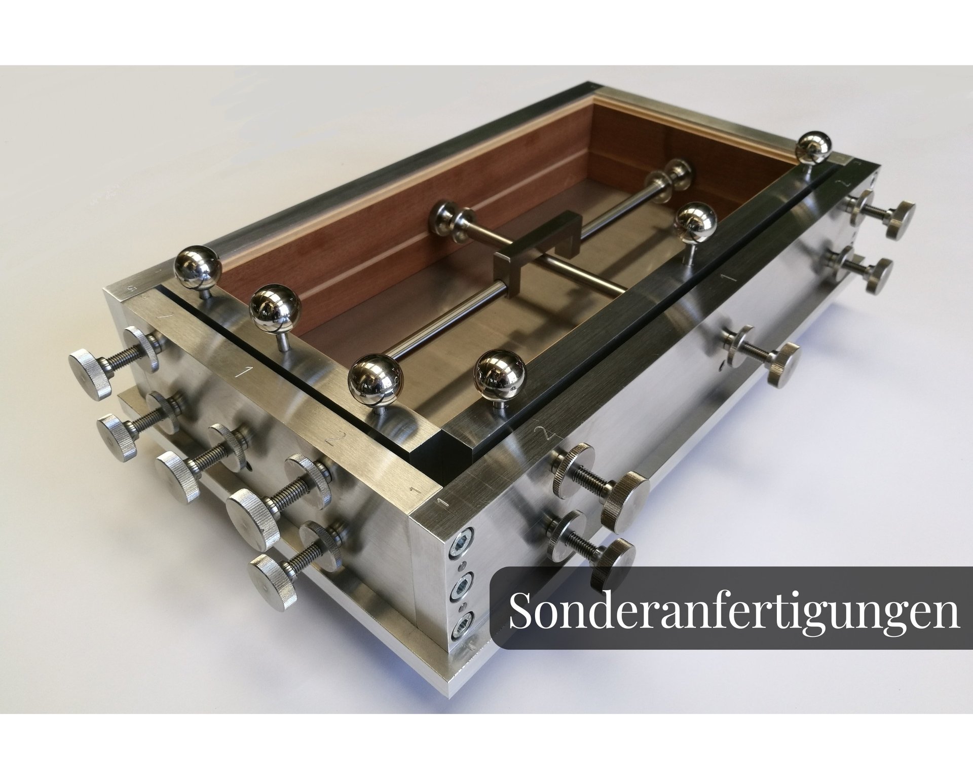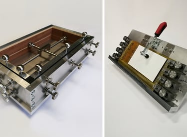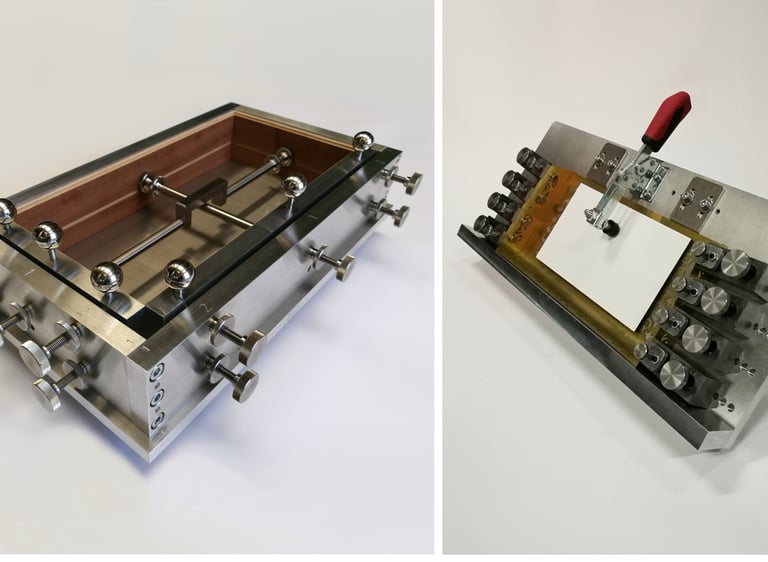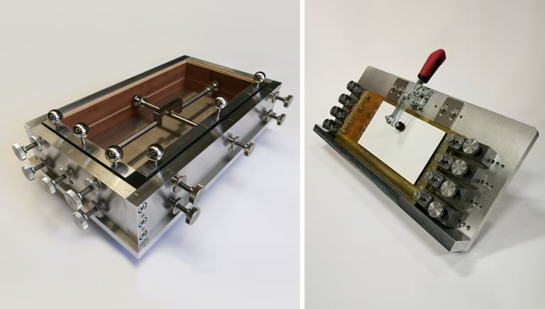 Bei diesen Beispielen handelt es sich um 2 Vorrichtungen für den Ziehharmonika-Bau. Links eine "Leimvorrichtung" und rechts eine "Lötvorrichtung", von uns vollständig konzipiert, konstruiert und gefertigt.
